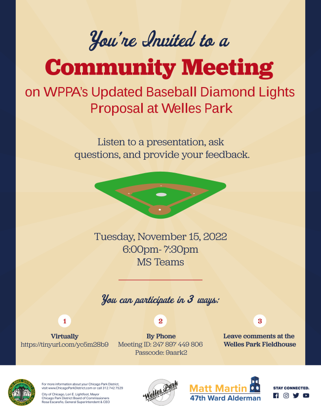 The public is invited to a community meeting on the Welles Park Parents Association’s proposal to install lights in Welles Park for the baseball and softball diamonds. The meeting will be hosted virtually by the Chicago Park District from 6-7:30 p.m. Tuesday, November 15. Click here to join the meeting.